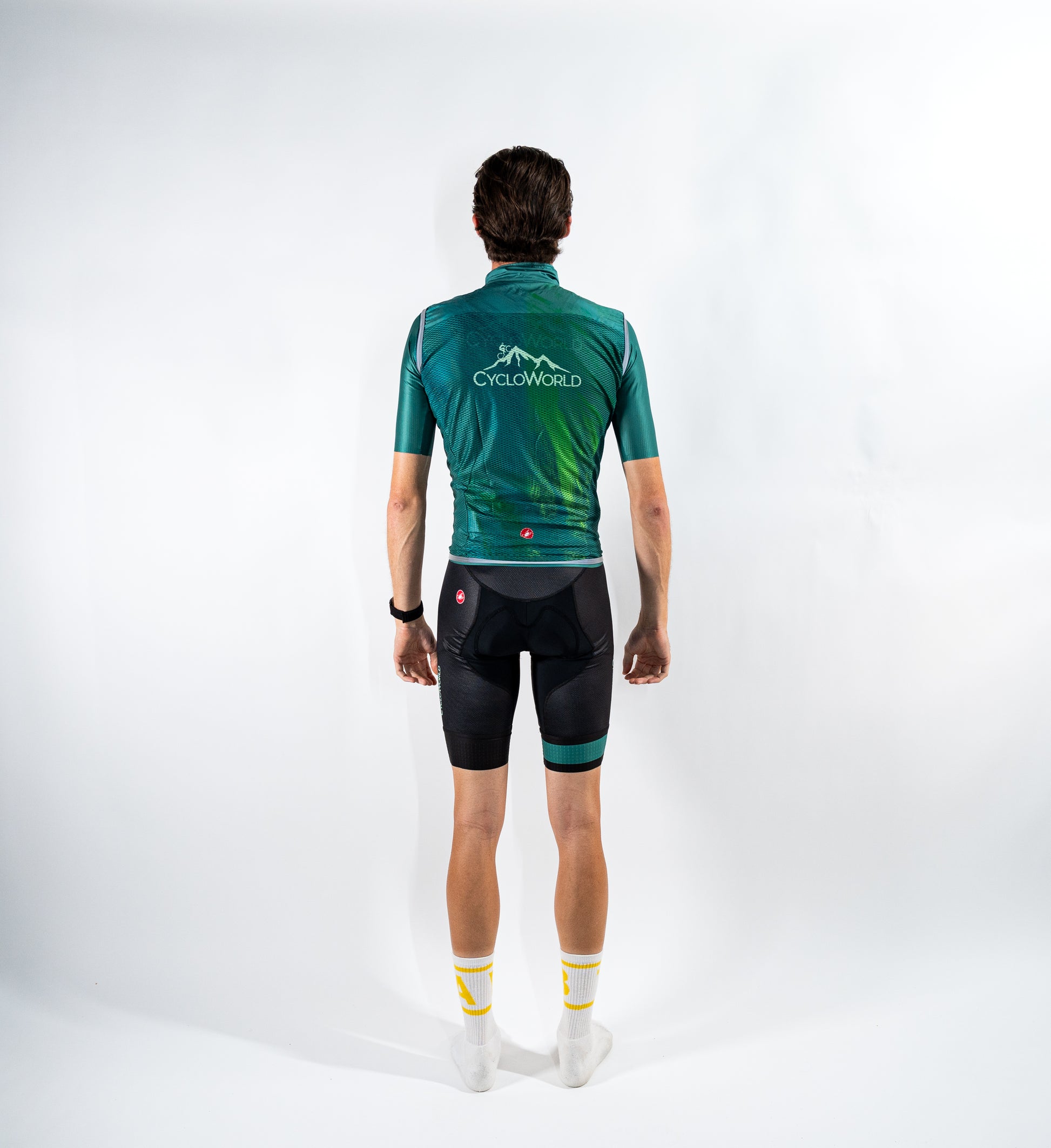A windstopper is the perfect garment for chilly mornings or days when it's just a bit too cold. And what could be better than a windstopper that seamlessly matches the British Racing Green CycloWorld kit? This windstopper offers ultimate comfort, is compact enough to store in your back pocket, and looks both stylish and striking.